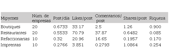 Según la evidencia los promedios de posts por día y likes por post, denota que las Boutiques y Restaurantes llevan a cabo los mayores esfuerzos de Facebook porque el promedio de posts/ día de 0.67 y 0.55 respectivamente aunados a sus promedios de likes/ post de 33.17 y 70.79 que lo confirman, mientras que las refaccionarias y las imprentas presentan valores promedios inferiores a la media de la muestra de estas mipymes. En contraste, respecto a comentarios por post, los resultados son diferentes ya que las empresas Restaurantes y Refaccionarias alcanzan en promedio 37.87 y 16.65 comentarios por post respectivamente, superiores a la media de la muestra de las mipymes consideradas (14.32). En cuanto a las comparticiones o shares por post, las empresas del tipo boutiques e imprentas, en promedio tienen 1.26 y 1.08 shares mayores a la media de la muestra de las post respectivamente los cuales son mipymes (79).