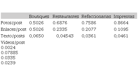 Asimismo, la Tabla 4 muestra que las imprentas prefieren informar a través de publicaciones con fotos (una media del 86.64% del total de publicaciones) y muy raramente a través de textos (4.61%) y de vídeos (2.39%), para el caso de las Boutiques el uso de enlaces es importante (50.26%) al igual que las fotos (50.26%), especialmente si se compara con la media de enlaces que es del 26.33%.