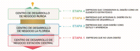 En el diagrama 1 se puede apreciar que el CDN de Estación Central se encuentra en la etapa 1 del Escalamiento de Diseño ya que sus clientes serían empresas que no usan el Diseño en su día a día. Por otra parte, el CDN de La Florida está ubicado en el segundo escalón, dado su enfoque gráfico en el cual los clientes acceden a una mayor variedad de herramientas orientadas a la propuesta de valor en torno a imagen e identidad del producto o servicio. Por último, el CDN de Ñuñoa le otorga una importancia aún mayor al Diseño, canalizando esfuerzos tanto hacia la imagen como al desarrollo estratégico del Diseño en procesos de desarrollo de producto, difusión en redes sociales y comercialización, ubicándose entre la etapa 3 y 4. De esta forma, al comparar el uso del Diseño del CDN de cada comuna, el diagrama 1 confirma que, a mayor uso del Diseño, mayor impacto económico y mayor éxito tiene la empresa.