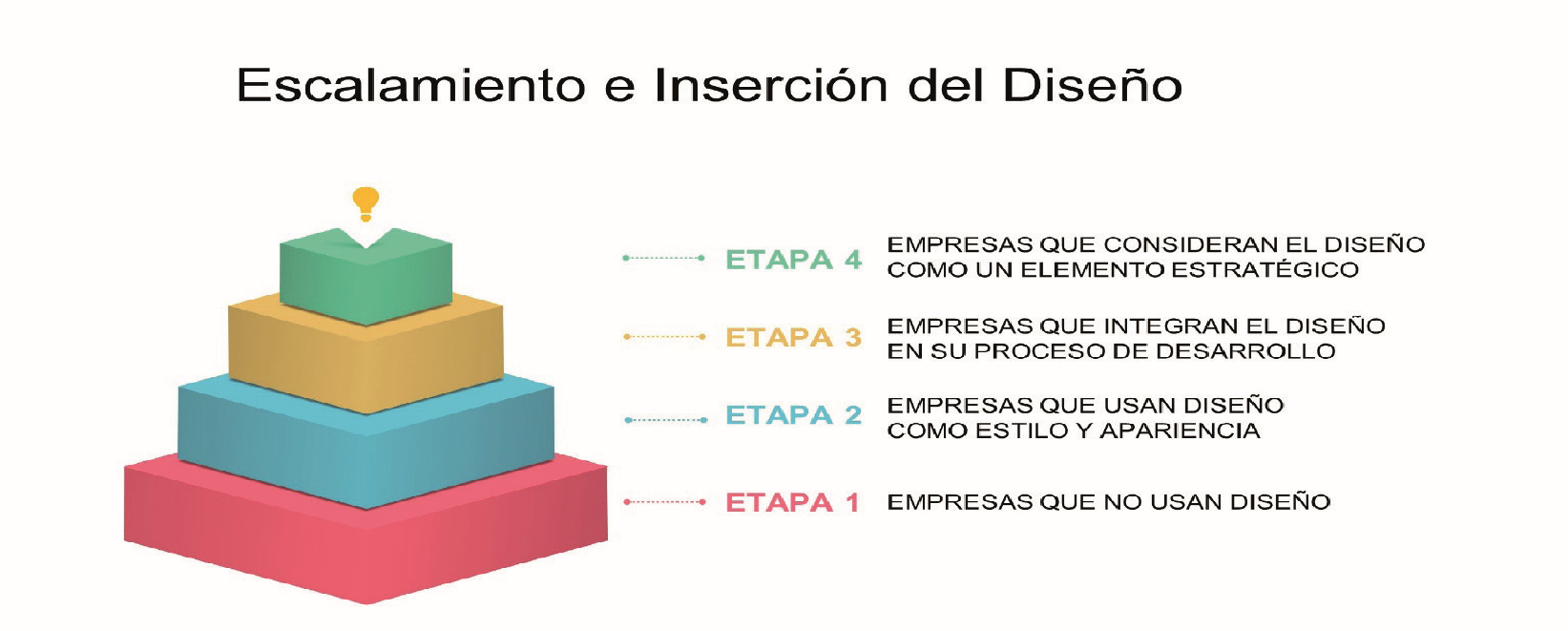 Con estos propósitos en mente, se puede visualizar el escalamiento y la inserción del Diseño en las empresas (Ramlau, 2004). El modelo del escalamiento e inserción, inicialmente planeado por Viladás (2010) propone diversos niveles, en orden ascendente, en los cuales se ubica una empresa dependiendo de su uso del Diseño como herramienta estratégica. Este modelo se apoya en la Escalera del Diseño (2003), un marco referencial de Dinamarca que se usa como un medio gráfico para explicarles a las empresas que Diseño puede tener una función mucho más compleja y profunda que estilo o estética, al igual que una medida para tasar los beneficios económicos de las empresas a nivel nacional (Fleetwood, 2005:4).
