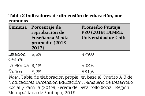 En cuanto a la dimensión de la Educación, es interesante notar que las comunas no caen en un orden ascendente tan claro, como en la dimensión de Ingresos. En cuanto al porcentaje de reprobación de la Enseñanza Media promedio, entre el año 2013 y 2017, Ñuñoa tiene el mayor índice de reprobación, mientras que La Florida se ubica en último lugar, y la comuna de menores indicadores de ingresos económicos está entre ambos lugares. Por otra parte, el promedio del puntaje de la Prueba de Selección Universitaria (PSU), del año 2019, delata que el mayor puntaje pertenece a Ñuñoa, el segundo puntaje más alto se obtiene en La Florida y el más bajo ocurre en Estación Central. Esto denota que, aunque hay mayor nivel de reprobación en Ñuñoa, aquellos estudiantes que completan la Enseñanza Media y pueden acceder a rendir la PSU, logran un puntaje mayor que el promedio de estudiantes en La Florida y Estación Central. Esta observación se puede tomar como el punto de partida para las entrevistas que vienen a continuación, y aluden a que, los recursos económicos de las personas en cada comuna, aunque denotan un factor determinante en cuánto a las dificultades para ser exitoso, son solo un aspecto del capital para emprender.
