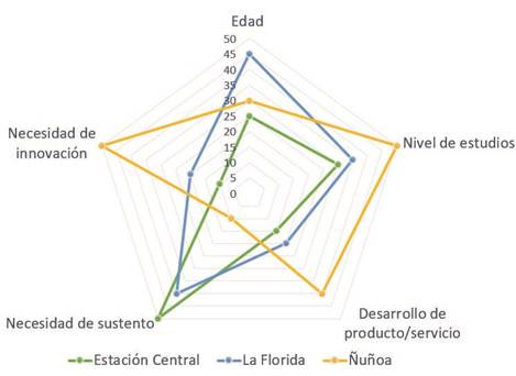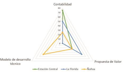 En el gráfico 2, se puede apreciar que la contabilidad tributaria es una gran urgencia para los emprendedores principalmente de Estación Central y, en un grado ligeramente menor, de La Florida. En segundo lugar, la propuesta de valor es un factor de preocupación para La Florida, Ñuñoa y, en menor grado para Estación Central. Por último, el modelo de desarrollo técnico, ubicado en un escalón superior en cuanto a estrategia de empresa, solo es considerado importante en el CDN de Ñuñoa; lo cual implica que el Diseño, presente solo en las propuestas de valor de productos y diseño de gestión en los modelos de desarrollo técnico, no es considerado una prioridad para la mayoría de los emprendedores considerados en este estudio.