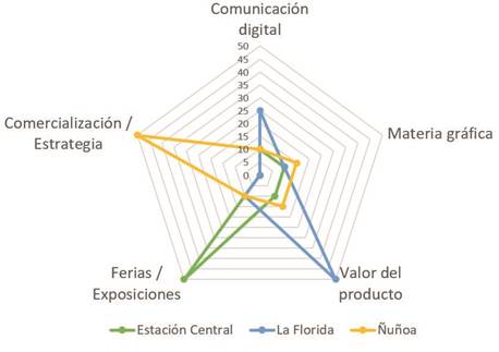 El gráfico 3 ha sido elaborado en base a las respuestas de los expertos a la pauta realizada por el investigador. En él, la función del Diseño y su lugar en CDN está configurado por los siguientes factores: comunicación digital; materia gráfica; valor del producto; ferias / exposiciones; comercialización y estrategia. La escala de valor, en esta determinación contempla un universo de 100% de la función del Diseño, que las comunas invierten en cada categoría. Esto significa que cada comuna determina cuánto porcentaje del universo invierte en cada aspecto del Diseño, siendo 10% un valor bajo y 100% el valor completo.
