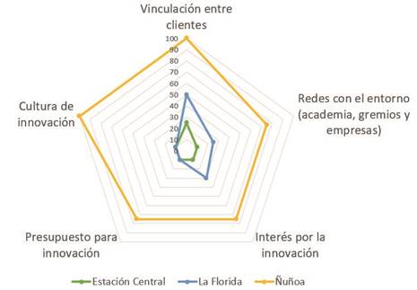 En cuanto a la innovación, los resultados de las entrevistas dejan entrever una incomprensión del concepto, el cual es erróneamente asociado principalmente a la innovación tecnológica de punta, lo cual, consecuentemente, implica un alejamiento de su utilidad práctica respecto a la realidad de los clientes de los centros. Como ejemplo, en las comunas de Estación Central y la Florida declaran dificultades para su aplicación desconociendo como acercar la innovación al día a día de los emprendedores. Una excepción a este hallazgo aparece precisamente en el centro con mejores indicadores socioculturales, Ñuñoa, en donde el encargado tiene preparación específica en el ámbito de la innovación y comprende el potencial impacto de la innovación en PYMEs y de los liderazgos que la promueven.