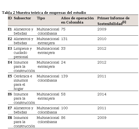 La muestra teórica se constituyó por ocho empresas con sede en Bogotá (Colombia) que debían cumplir con tres criterios de inclusión: i) que fuera una empresa altamente formalizada y de tamaño grande; ii) que fuera una empresa que hubiera realizado por lo menos tres reportes de sostenibilidad; y iii) que perteneciera al sector industrial con importante experiencia de operaciones en el país. Las razones de estos criterios de inclusión implicaban una muestra de empresas homogéneas donde el negocio y el modelo de gestión estaban consolidados; las empresas evidenciaban una apuesta explícita por la RSE y sus prácticas; y todas configuraban una cadena de valor larga y con múltiples stakeholders y relaciones.