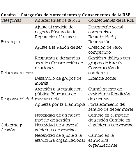 2012; Fifka, 2013; Jamali y Karam, 2016; Jain y Jamali, 2016). Para este ejercicio comprensivo, se consideran cuatro categorías para agrupar los antecedentes y consecuentes. (Ver cuadro 1).