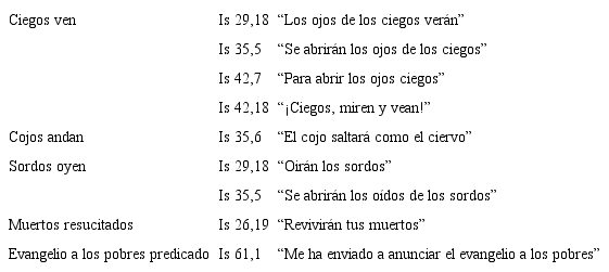 Así, en Mt 11,2-6 y su paralelo de Lc 7,18-28, ante la pregunta que hace Juan desde la cárcel sobre si Jesús es “el que ha de venir” o se debe esperar a otro, la respuesta de Jesús, más que afirmativa o negativa, remite a sus obras que permiten, a su vez, ser reconocidas como las señales esperadas de la llegada del eschaton. En términos de Graber (2003: 262), “Jesús da a entender que en su actuación y en su obra se ha hecho presente la salvación allí prometida y que ha hecho irrupción la era paradisíaca, en la que ya no habrá ceguera o sordera alguna”: “Vayan y cuenten a Juan lo que oyen (ἃ ἀκούετε) y ven (βλέπετε)13: los ciegos (τυφλοὶ) ven (ἀναβλέπουσιν 14) y los cojos andan, los leprosos quedan limpios y los sordos (κωφοὶ) oyen (ἀκούουσιν), los muertos resucitan y se anuncia a los pobres el evangelio” (Mt 11,4-5: Lc 7,22). En la respuesta de Jesús, aunque se inserta el motivo de la limpieza de los leprosos, resulta innegable el marcado trasfondo isaiano, señalado por Allison (2000: 109) a través del siguiente esquema: