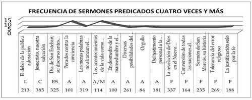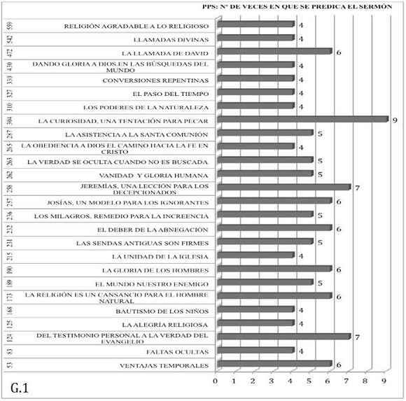 Hemos dicho que algunos de los sermones anglicanos fueron predicados varias veces. Se iban corrigiendo, modificando, profundizando, u orientando en perspectivas diversas según las motivaciones y contextos que a Newman le urgían. Algunos sermones de los Parochial and Plain Sermons fueron predicados, de hecho, hasta nueve veces. Esta estadística nos permite no solo reconocer la reiteración de los sermones como tales, sino también hacer un alcance cualitativo de los temas a los que nuestro autor recurría con más frecuencia, de lo que se deduce que eran sus prin cipales inquietudes. Las fuentes del análisis estadístico que a continua ción comenzaremos a desarrollar, hacen uso de la totalidad de los ser mones anglicanos de Newman y recoge los datos obtenidos de la suma de antecedentes de la publicación general de sermones Sermons 1824 1843, en todos sus apéndices (Newman, 1991).