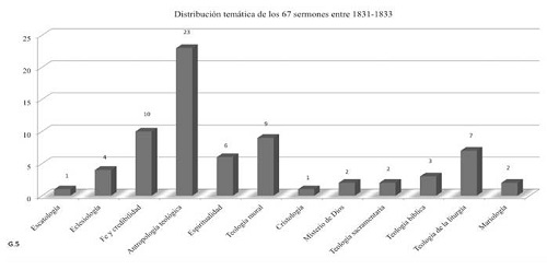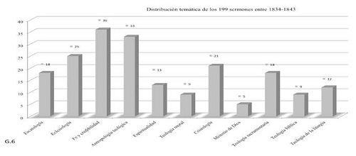 En resumen, al recorrer los 153 sermones de su primer período como predicador (1824-1827) se pueden identificar las temáticas más recurrentes. El tema de la escatología con el recurso inminente de la segunda venida de Cristo está presente de modo importante en este tiempo (14 sermones); de igual manera los temas relacionados con la Iglesia y su identidad en el mundo (16 sermones); y las ideas sobre la fe y la credibilidad evangélica (22 sermones). Pero serán sobre todo, las materias relacionadas con la antropología y la moral las que cubrirán su mayor producción de sermones, lo que nos da un indicio claro de como las tendencias evangélicas de su primer período como clérigo, se van entremezclando progresivamente hacia la interpelación más racional. El gráfico (G.3), muestra como se distribuyen las temáticas y en qué proporción estas se encuentran presentes . 10
