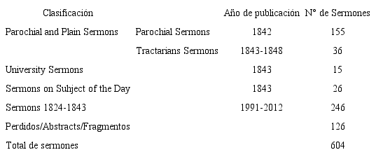 Estos títulos -pensamos-, tienden a confusión. Los Sermones universitarios, se asemejan más bien a la idea que hoy tenemos de una conferencia o disertación académica, o discurso. Esto, en razón del aporte y estudio que Newman realiza a través de ellos, sobre todo, en lo que respecta a las relaciones fe y razón, por lo cual han sido estudiados. El mismo Newman señalaba que se trataban de ensayos, porque tienen carácter de investigación, predicados a un auditorio ilustrado con el fin de comunicar estudios realizados. Agréguese a ello que fueron presentados en ocasiones particulares y en etapas concretas; 1826 (I); 1830-1832 (II-IX); 1839-1843 (X-XV). En este sentido creemos que distraen de un pensamiento más genuino del autor en cuanto elaboración, si se quiere, eminentemente sistemática. A modo de síntesis estadística de toda esta elaboración resumimos en el cuadro siguiente las conclusiones de la producción de sermones de Newman como anglicano: