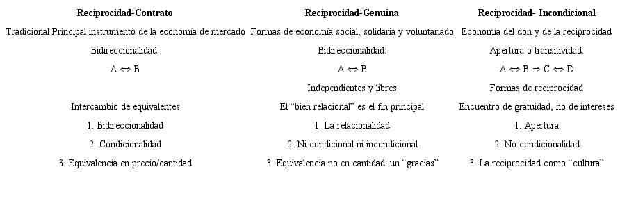 Son tres las principales formas de reciprocidad, todas importantes pero la última indispensable para una “economía del don y de la reciprocidad”: