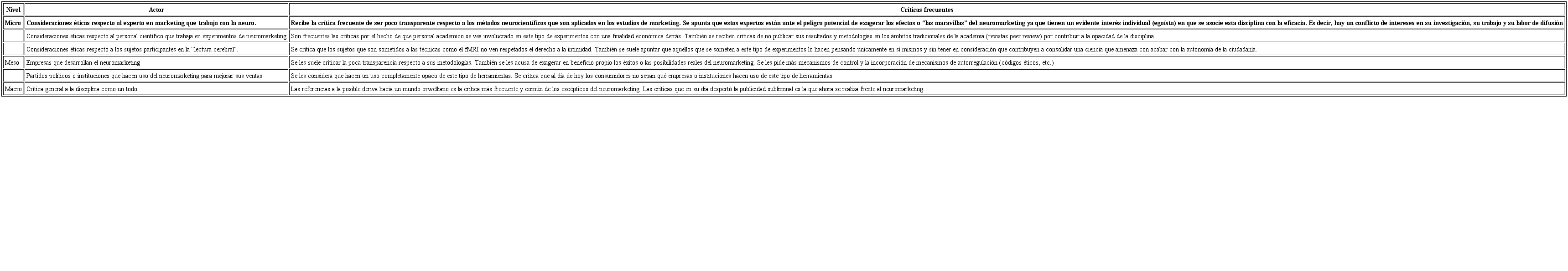 De esta manera, si atendemos a la literatura de los críticos del neuromarketing vemos como las múltiples críticas existentes se dirigen principalmente a dos niveles básicos de la ética: el nivel micro y el nivel meso. El primer nivel (micro) integra a los actores individuales que participan de la puesta en práctica del neuromarketing y que incluyen a expertos en marketing, personas del ámbito médico, así como sujetos que se someten individualmente a las diferentes pruebas neurocientíficas. En el segundo nivel (meso) podemos diferenciar a las instituciones o corporaciones que participan del neuromarketing. En el caso del neuromarketing político afecta a los partidos políticos que contratan los servicios del neuromarketing así como las empresas que explotan estas técnicas y la aplican a la comunicación política. Asimismo, podríamos llegar a apreciar un nivel macro, que integraría especialmente las críticas a esta disciplina en su conjunto. Más específicamente podemos desarrollar la siguiente clasificación en función de las críticas y preocupaciones que despierta el neuromarketing político y los niveles a los que afecta: