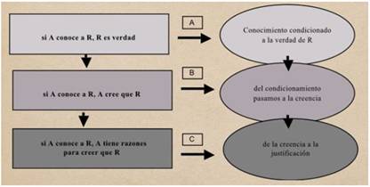 En los dos primeros casos el conocimiento pasa a ser una realidad que acontece en el sujeto, pero esto cambia en C donde si bien el que conoce es el individuo ―por tanto, sigue presentándose cierta subjetividad―, al darse las razones del porqué A conoce a R y las razones de A para creer que R, se podría suponer que aquello que A conoce también podría conocerlo X o Z. En este nivel referencial del conocimiento se habla de una realidad objetiva, y en cuanto objetiva el sujeto cognoscente pierde relevancia en el procedimiento epistemológico mismo. En consecuencia, la clave positivista haría más verdadero el conocimiento, dado el carácter científico que le induce. La pregunta que surge en este contexto es saber si existen verdades que, no siendo justificadas bajo categorías lógico-formales de la ciencia, como en el ejemplo recién descrito, pueden efectivamente reconocerse como verdades.