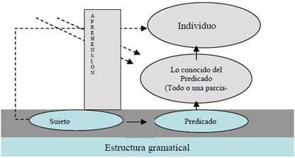 Newman comienza describiendo cómo se da el proceso y ejercicio cognoscente en el ser humano. La primera exigencia que plantea es el correlato natural entre la realidad del objeto y aquello que de el se aprehende. Dicho gramaticalmente, el predicado dará cuenta de aquello que se aprehende del sujeto, pero a su vez, se requiere que lo que el predicado enuncie sea conocido. De este modo la relacionalidad entre sujeto cognoscente y objeto conocido logra ser aprehendida y asentida7. Así lo expresa el siguiente esquema: