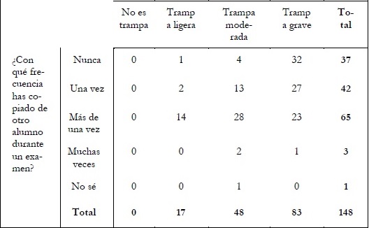 Todos aceptan que es trampa, aunque difieren en el grado de gravedad. Un 56% (83 alumnos) aceptan que es una trampa grave; entre éstos están el 86% (32 de 37 alumnos) de los que nunca han copiado de sus compañeros en un examen. Quizás su convicción de que es una trampa grave, es lo que les ha permitido resistir la tentación en la que caen otros. Por el contrario, de los que creen que es una trampa ligera, el 82% (14 de 17 alumnos) han copiado en exámenes más de una vez. ¿Será que creen que “no pasa nada” y por ende copian, o que el hecho de haber copiado les hace ser más tolerantes ante ese comportamiento? Esta es una pregunta de causa y efecto, con un aspecto psicológico, que estos datos no nos permiten contestar. Del otro extremo, muy irónicamente, los tres alumnos que aceptan haber copiado en exámenes “muchas veces” consideran que la copia es una trampa moderada (2 alumnos) o grave (1 alumno). De hecho, hay 54 alumnos (36% del total) que admiten haber copiado “más de una vez” o “muchas veces” a pesar de considerarlo una trampa de moderada a grave.