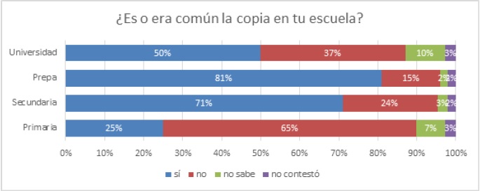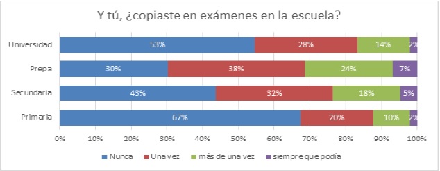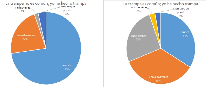 … aun cuando criticamos ciertas acciones de los demás, seguimos actuando de esa misma forma.… [D]e 37 personas a las que se les hizo la pregunta ¿consideras que copiar de otro alumno durante un examen es trampa? 21 de ellas contestaron que era trampa grave, 12 encuestados lo consideran trampa moderada, mientras que 4 piensan que sí es trampa aunque ligera; con estos datos se puede decir que el 100% de los entrevistados consideran que es trampa copiar a otro alumno durante un examen. No obstante, al hacer la pregunta ¿has copiado en exámenes en la primaria, secundaria, preparatoria o universidad? Solo 8 encuestados dijeron no haber copiado nunca en ningún nivel escolar mientras que uno dijo no saberlo; es decir, el 75% de las personas que respondieron la encuesta ha copiado en algún examen aun cuando lo considera como trampa…