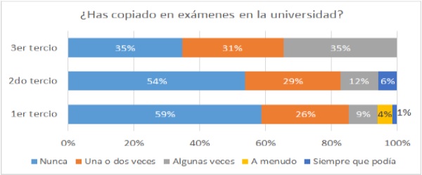 Como la pregunta anterior representa una percepción del alumno, debemos comprender que dicha percepción puede ser influenciada por varios factores, por lo que decidimos preguntar también si ellos mismos habían copiado en exámenes, durante cada nivel escolar, para notar la consistencia del posible patrón. Como se observa en la siguiente gráfica, sí se repite el patrón: entre más avanzan en el sistema educativo, más recurren a la copia, con una baja a nivel universitario. Sin embargo, esta reducción a nivel universitario puede deberse a que a la hora de hacer estas encuestas sus estudios de preparatoria ya están terminados y sus estudios universitarios están todavía en curso y no les es posible evaluar de golpe todos sus estudios universitarios. Esta intuición nos llevó a desagregar las encuestas por semestre y vimos que efectivamente, si tomamos en cuenta las encuestas solamente de los alumnos en semestres avanzados, de séptimo en adelante, aparece el mismo porcentaje de deshonestidad en la universidad que en la prepa. Entre los de noveno, las encuestas arrojan que todos (100%) han copiado al menos una vez y 67% han copiado varias veces.
