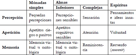 Al considerar la teoría leibniziana de la percepción que he presentado en el primer apartado de esta investigación y la reconstrucción que elaboro tanto su noción de apercepción sensible como su caracterización de la cons-cientia, en el segundo y tercer apartado respectivamente podemos articular su taxonomía de las mónadas en función de tres elementos: 2. el tipo de percepción; 2. la naturaleza de sus apetitos; y 3. el tipo de memoria que son capaces de alcanzar acorde a su grado de perfección. Todas las mónadas, acorde a lo mencionado en los apartados anteriores, poseen al menos las primeras dos, mientras que la conciencia sólo se presenta en las almas y los espíritus, tal y como se presenta en el siguiente cuadro: