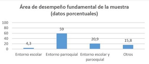 La distribución de la muestra en relación con el ámbito de desempeño evidencia que la intervención en el área parroquial es principalmente la tarea fundamental de la muestra (véase la Gráfica 1 en la página siguiente).