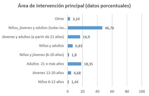 Por otro lado, conviene determinar cuál es el área principal de inter vención de los sujetos de la muestra (véase en la página siguiente Gráfica 3) y si hay, o no, un uso diferenciado de las distintas redes en función de las distintas áreas de intervención (véase Gráfica 5 en la p. 191) para poder establecer, en su caso, la conveniencia del uso de las RRSS, incluso cuáles podrían ser las más apropiadas, en función del perfil de los destinatarios específicos de la intervención ministerial de los sujetos objeto de estudio.