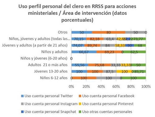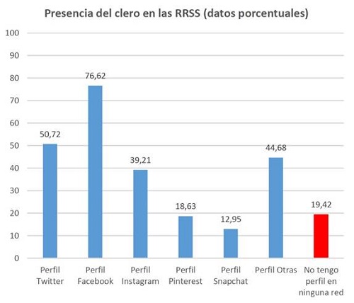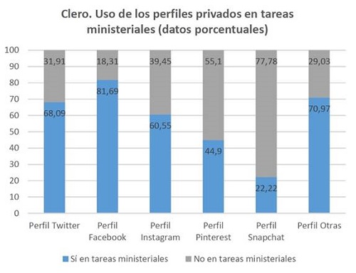 De entre las redes sociales analizadas, la red que cuenta con más presencia de presbíteros es Facebook. En sentido contrario, la menos utilizada es snapchat. sin embargo, algunas investigaciones recientes (Marcelino, 2015) evidencian que está habiendo una migración de jóvenes de la red social Facebook hacia Instagram. Elemento que podría ser una variable a considerar en el análisis de la constatable desafección creciente de los jóvenes de la Iglesia.