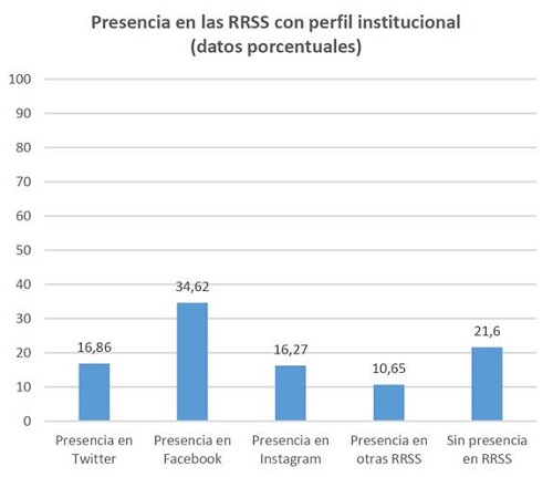 Aun siendo igualmente Facebook la red preferida por las instituciones para participar en este ámbito, desciende un 42% la presencia, pasando de un 76,62% de perfiles individuales a un 34,62% de perfiles institucionales. Lo mismo pasa con el resto de redes analizadas, algunas, incluso, ni siquiera se consideran desde el punto de vista institucional (Pinterest o Snapchat)
