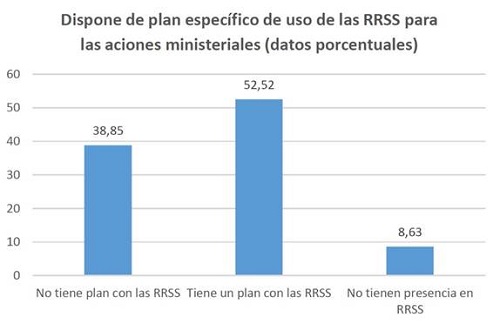 En todo caso, y a tenor de los resultados recogidos, el uso de las RRSS para las acciones ministeriales no forma parte relevante en la planificación de su labor y actuaciones (Gráfica 8), distribuyéndose casi al 50% los que trabajan con un plan establecido (52,52%) y aquellos que no tienen un plan o no se lo han planteado siquiera (38.85%) o no procede, por no tener presencia en las RRSS (8,63%).