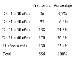 Como se puede comprobar en los grupos de edades (Tabla 1) encon tramos que un 54% de la muestra cuenta con 51 años o más.