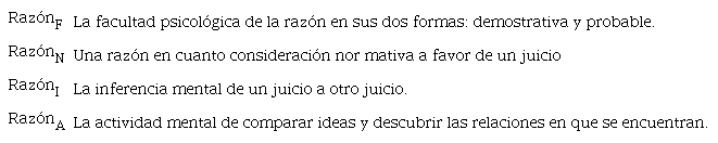 La razón considerada como facultad psicológica -razón-, incluye dos subcategorías: la razón demostrativa (aquella razón sensible a relacio nes necesarias de ideas) y la razón probable (aquella razón sensible a la relación filosófica de causa y efecto). Las relaciones de las que se ocupa la razón como facultad psicológica -razónF- en sus dos formas son sin duda alguna razonesN, es decir, razones en cuanto consideraciones normativas a favor o en contra de un juicio. Ahora bien, la actividad mental de descubrir las relaciones y comparar las ideas que figuran en estas relaciones es lo que Kail llama razonamientoA, noción que Hume tendría en mente al decirnos que “todas las clases de razonamiento no consisten sino en una comparación y descubrimiento de las relaciones... que dos o más objetos guardan entre sí” (Hume, 2007: 1.3.2.2). Finalmente, tenemos la razónI la cual se refiere fundamentalmente a los razonamientos en cuanto forma de inferencia o transición de la imaginación de un juicio a otro.