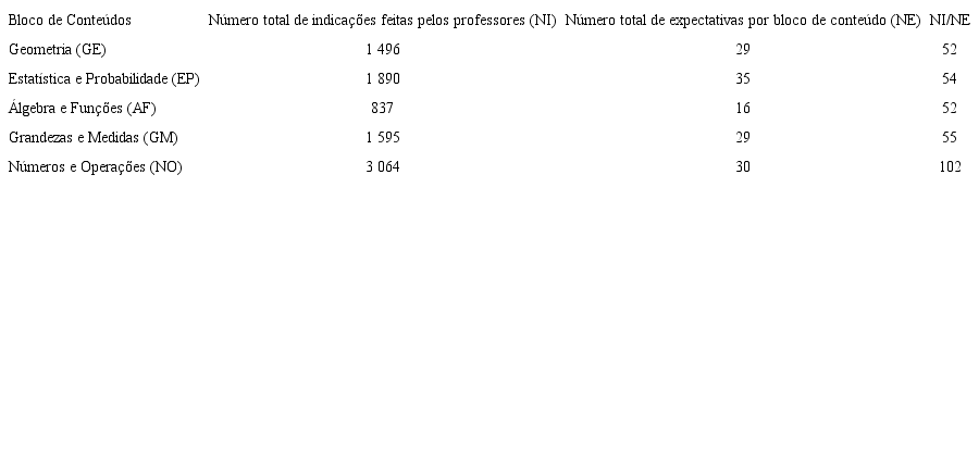 Observa-se que a razão entre o número de indicações e o número de descritores parece acompanhar o que comumente encontramos na literatura, ou seja, o professor fica mais à vontade para opinar sobre o bloco que ele tem mais intimidade, Números e operações (NO), cuja razão entre o número de indicações realizadas e o número de expectativas do bloco de conteúdos é de 102, ou seja, para cada uma das expectativas desse bloco foram feitas, em média, 102 indicações sobre o ano escolar em que a expectativa deveria ser trabalhada. Em segundo lugar aparece o bloco de Grandezas e medidas (GM) com 55 indicações. Os menos indicados são Geometria (GE) e Álgebra e funções (AF), ambos com 52 indicações. A pouca indicação às expectativas do bloco Álgebra e Funções deve-se, possivelmente, ao fato de que normalmente tais tópicos não aparecem, pelo menos não explicitamente, nos livros didáticos dos Anos Iniciais. O terceiro colocado nas prioridades dos professores foi o bloco Estatística e Probabilidade (54 indicações). Ortigão, Franco e Carvalho (2007) também observaram pouca predominância na seleção de conteúdos de Tratamento da Informação e de Grandezas e Medidas, quando comparados aos conteúdos dos outros blocos.