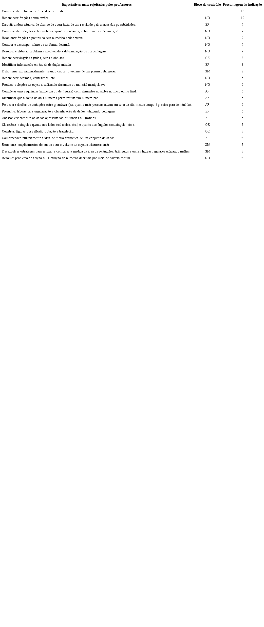 Outra hipótese que poderíamos elaborar é que as expectativas com menos indicações são aquelas em que o professor poderia apresentar conhecimento pouco elaborado. Fennema (1993) verificou que professores com melhor conhecimento matemático buscam envolver seus alunos em situações de resolução de problemas mais complexos, evitando a ênfase em atividades que se reduzem unicamente a processos de memorizações e repetição de procedimentos. Nos resultados encontrados em nosso trabalho, expectativas de aprendizagem que demandam um maior esforço cognitivo foram as mais rejeitadas pelos professores, ou seja, as que tiveram maior percentual de não deve ser trabalhada nos Anos Iniciais do Ensino Fundamental. Elas são apresentadas na tabela abaixo, em ordem decrescente de percentual de rejeição.