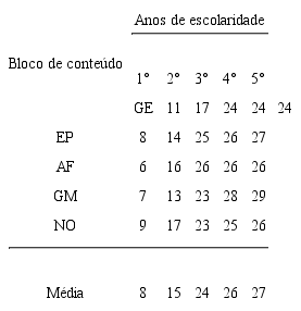 A tabela a seguir mostra o percentual médio de indicações por blocos de expectativas e por ano de escolaridade.