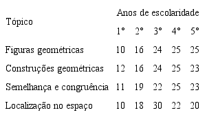 Na elaboração dos Programas de Ensino, etapa posterior aos Parâmetros Curriculares, do Projeto Parâmetros da Educação Básica de Pernambuco, as expectativas dos cinco blocos de conteúdos foram agrupadas por tópicos, ou seja, por afinidades de conteúdos. A tabela abaixo mostra o percentual médio de indicações por tópicos de conteúdos do bloco de Geometria.