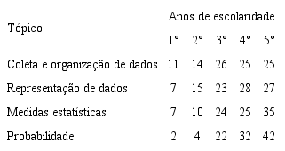 As medidas estatísticas também são bastante estranhas ao professor. A expectativa “compreender intuitivamente a ideia de moda” foi rejeitada por 16% dos sujeitos, mesmo percentual daqueles que não responderam; ou seja, apenas dois terços dos professores indicaram seu ensino nesta fase escolar. O mesmo aconteceu com o conceito de média. Em relação às ideias iniciais de probabilidade, mais de 40% dos professores indicou as respectivas expectativas como devendo ser trabalhadas somente no 5° ano. No caso da ideia de chance, 9% dos sujeitos rejeitaram a expectativa, e um em cada cinco professores não respondeu, indicando desconhecer o conceito.
