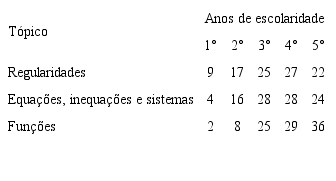 A tabela a seguir mostra o percentual médio de indicações por ano de escolaridade e tópicos para o bloco de conteúdos de Álgebra e funções.