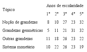 O percentual médio de indicações por ano de escolaridade e tópicos para o bloco de conteúdos de Grandezas e Medidas é apresentado na tabela a seguir.