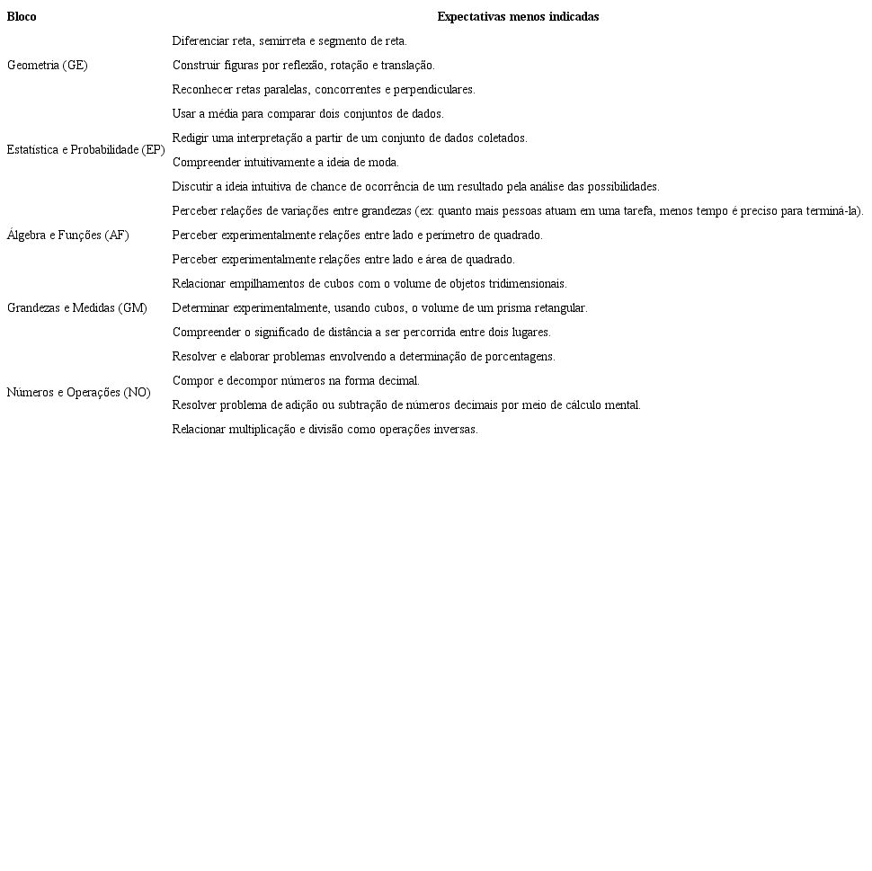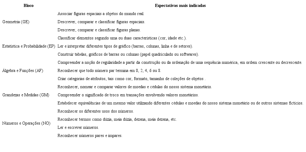 O quadro a seguir apresenta as expectativas de aprendizagem que tiveram mais indicações por parte dos professores, por bloco de conteúdos.
