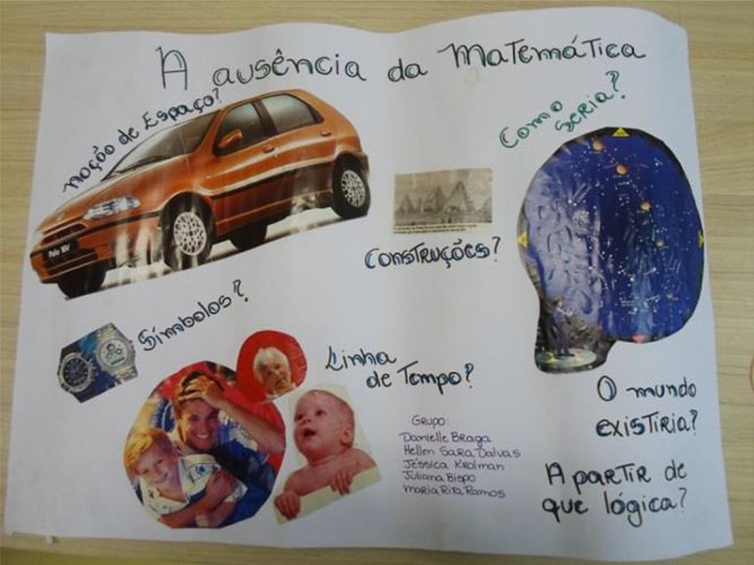 Quando eu e meus colegas começamos a pensar no grupo parecia que não conseguiríamos fazer nada: como seria um mundo sem matemática? Mas, chegamos a confeccionar um cartaz no qual dizíamos que, num mundo sem matemática, estávamos no vazio. Até porque partimos do pressuposto de que ela – a matemática – já existia e, por isso, não conseguimos nos desapegar dela. Isso ocorreu também na apresentação de outros grupos. Foram apresentadas diversas visões e possibilidades de um mundo sem matemática, mas também, em todas elas, não havia seres humanos. Será porque associamos a matemática aos seres humanos?