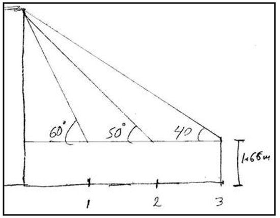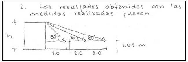 Encontramos nueve reportes (21%) que no indican una relación lineal entre el ángulo y la distancia a la que se sitúan del objetivo (Figura 8), once reportes (26%) que la establecen entre dos ángulos-distancias (Figura 9); y diez y siete reportes (40%) que la establecen entre los 3 ángulos-distancia (Figura 10). Tres profesores no reportan las medidas del ángulo, aunque declaran haberlos medido; y en otros dos de los reportes no hicieron las mediciones porque utilizaron triángulos semejantes a partir de la inclinación del tubo dirigido al objetivo.