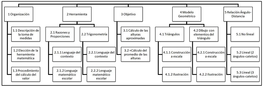 Con el tercer criterio se hace una diferencia entre los reportes donde el profesor sólo calcula las tres alturas aproximadas y los reportes donde, además, promedia las alturas, intentando evidenciar hacia dónde se dirige el énfasis de la actividad matemática del profesor. El cuarto criterio distingue si el modelo geométrico en el reporte se compone sólo de triángulos o de un dibujo de la situación que se está modelando, en donde incluya elementos del triángulo, las distancias y los ángulos; distinguiendo, además, si los triángulos o los dibujos son representaciones a escala de la realidad. Finalmente, el quinto criterio distingue si el profesor plantea una relación no lineal o lineal entre el ángulo y las distancias a las que se sitúa cuando toma las medidas angulares, o no. Para considerar el subcriterio 5.2, donde se establezca la relación lineal entre dos mediciones, éstas deben ser continuas, es decir, a 1 y 2 metros o a 2 y 3 metros desde la posición donde el profesor toma la medida angular.