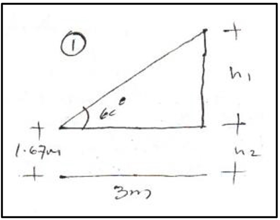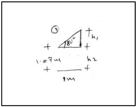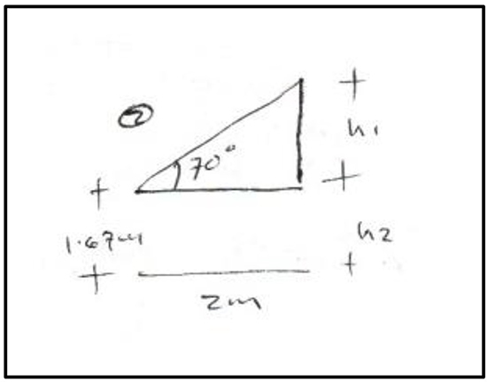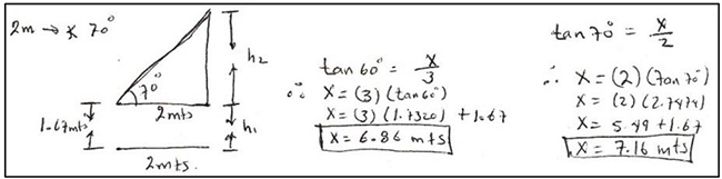 El segundo criterio de análisis se basa en distinguir la herramienta matemática con la que los profesores resuelven la situación problema y hace diferencia entre elegir alguna de ellas utilizando de manera integrada el lenguaje típicamente escolar (tangente, cateto opuesto, cateto adyacente; en algunos casos sin unidades de medida) con el lenguaje del contexto de la situación-problema (altura, distancia, ángulo de inclinación; y sus correspondientes unidades de medida); o utilizándolos de manera desarticulada. Ejemplo de este último caso lo mostramos en la Figura 3, donde el profesor obtiene los valores en términos de x (incógnita despejada de la fórmula de la razón trigonométrica tangente) y sus ilustraciones de referencia a la situación están en términos de h1 y h2; además de sumarle la altura del observador, a cada caso, sin hacer alguna alusión al origen de esta medida.