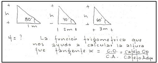 En los reportes entregados por los profesores se pueden observar distintos fenómenos. Por ejemplo, quienes utilizan la razón trigonométrica tangente (RTT) como herramienta para resolver el problema hablan de función trigonométrica, función tangente, procedimiento trigonométrico, relación tangente, razones trigonométricas o, simplemente, fórmula tangente. En principio consideramos que debido a que en el nivel medio superior se trabaja con mucho más énfasis en las funciones trigonométricas esta ambigüedad entre razón (también vista como fórmula o procedimiento) y función es bastante frecuente.