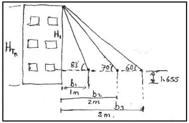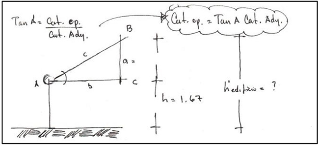 Los pasos que sigue el profesor para calcular la altura de un objetivo alto, tomando medidas a 1, 2 y 3 metros de distancia, son básicamente los de la tradición escolar. Sin embargo, la representación gráfica nos muestra que la costumbre didáctica de enfatizar la relación proporcional entre los lados del triángulo rectángulo pudiera sugerir, también, una relación lineal entre el ángulo y el cateto adyacente, cuando éste, para el caso de la experiencia, incrementa su medida en forma constante.