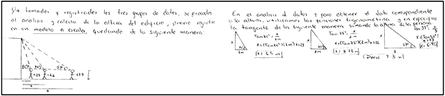 Un reporte sólo describe las actividades realizadas en equipo y declara haber calculado las alturas, sin mencionar haberlas promediado; sin embargo, no reporta las medidas encontradas. Otro reporte, que igualmente describe todo sin reportar cálculos y resultados, señala que con la información recabada se encuentra la altura del objetivo, pero no dice explícitamente haber calculado el promedio de las alturas calculadas.