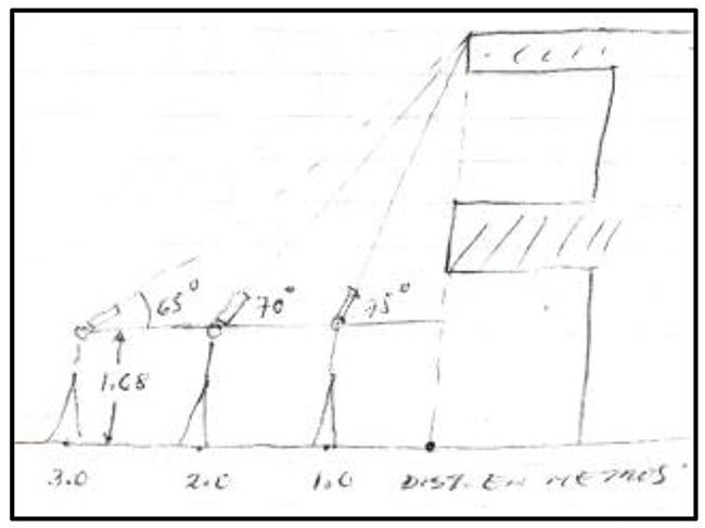 En veinte reportes (48%) encontramos dibujos de la situación, de los cuales dieciséis son ilustraciones (no representaciones a escala) a las que sobreponen los elementos de los triángulos como referencia para el cálculo de la altura en cada uno de los tres casos (a 3, 2 o 1 metro de distancia). Los cuatro dibujos restantes hacen uso de una ilustración genérica para todos los casos (Figura 6).