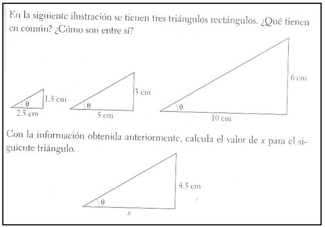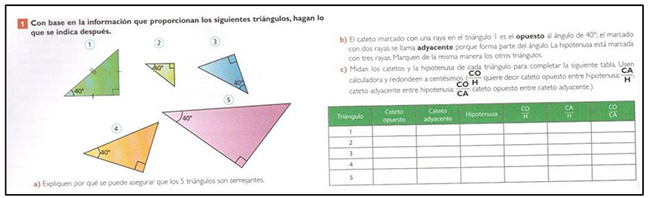 En el sistema escolar mexicano se introducen, por primera vez, las razones trigonométricas en el tercer año de la educación secundaria, cuando los alumnos tienen entre 14 y 15 años de edad. Los programas y planes de estudio de este nivel están regulados centralmente por la SEP y en la Reforma del 2006 a la Educación Secundaria (SEP, 2006, p. 132) se establece, en términos de conocimientos y habilidades, qué es lo que los alumnos de este nivel deben saber sobre la razón trigonométrica: