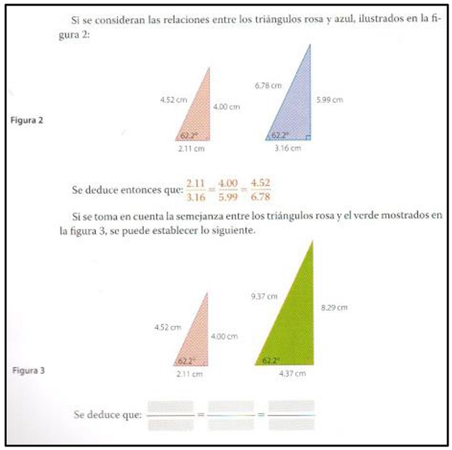 Las regularidades, en el triángulo, de donde surgen las razones trigonométricas se establecen en relación a un mismo ángulo (ver por ejemplo, Figuras 11, 12 y 13), con base en lo cual adquiere sentido hablar de razón cuando se establecen las razones trigonométricas. Para identificar la razón constante en relación a un ángulo en particular se utiliza un lenguaje geométrico-proporcional (triángulos rectángulos, triángulos semejantes, razones y proporciones), sin embargo, los triángulos no se construyen sino que se le proporcionan al estudiante para que sean medidos, en el mejor de los casos, o se identifiquen las medidas correspondientes al ángulo, los catetos y la hipotenusa. Algunos textos pasan de la expresión proporcional al cálculo de cocientes para establecer las razones trigonométricas (Figura 13).