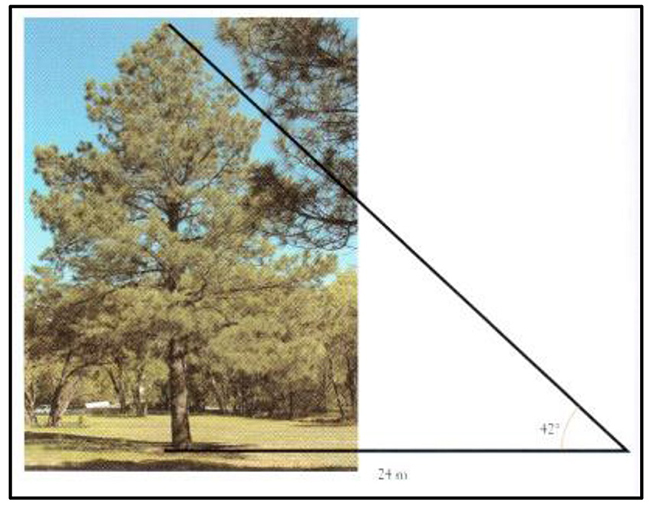 Los textos revisados incluyen, en los ejercicios de aplicación, problemas de cálculo de distancias inaccesibles en los que se proporcionan las medidas del ángulo de depresión o elevación, según sea el caso, y de la distancia que sí se conoce. Es común que en el dibujo que representa la situación a medir se sobrepongan los triángulos con las distancias conocidas, y esto permite elegir, con base en la memorización, la relación trigonométrica a utilizar (Figuras 14 y 15). Es decir, no hay en sí un análisis de la situación, sino del triángulo y éstos no son construcciones geométricas en el sentido estricto. Esto explica por qué no hay modelos a escala, aunque así los llame el profesor (Figura 7). Una característica invariante del dTE es su abandono de las construcciones geométricas propias de las actividades que le anteceden en el Plan de Estudios.
