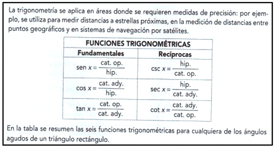 Finalmente, encontramos en uno de los textos un cuadro sintético de las fórmulas para calcular valores trigonométricos que, aun estando en el tema de Razones Trigonométricas y de usar sus expresiones en forma de razones, denominan como Funciones Trigonométricas (Figura 16) sin hacer reflexión sobre la naturaleza de cada una (razón o función).