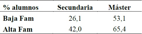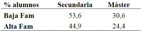 La Figura 2 muestra, y permite comparar, los porcentajes de estudiantes de Secundaria y de Máster cuyas agrupaciones en Baja y Alta Familiaridad, pueden asociarse con cada uno de los criterios expuestos en el Cuadro 3.